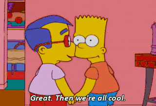 Great. Then we're all cool. (SOBBING) Since he's been back, Milhouse has had three bloody noses and stepped in dog doo.