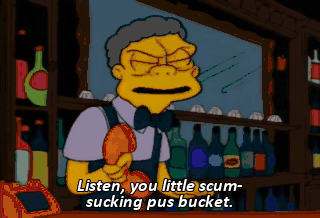 Listen, you little scum-sucking pus bucket. When I get my hands on you, I'm gonna pull out your eyeballs with a corkscrew. Oh, it was busy. Moe, another last beer, please.