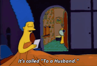 - It's called "To a Husband." - Okay, okay. "The blackened clouds are forming--" Oh, give me a break, Marge. "Soon the rain will fall.