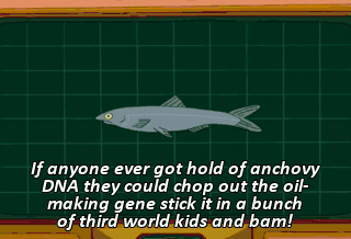 If anyone ever got hold of anchovy DNA they could chop out the oil-making gene stick it in a bunch of third world kids and bam! Cheap, effective robot oil--