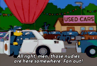 All right, men, those nudies are here somewhere. Fan out! Oh, we're surrounded, Marge. Maybe we should give ourselves up.