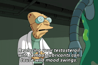 Replacing your testosteroil with fembot lubricants can cause wild mood swings.