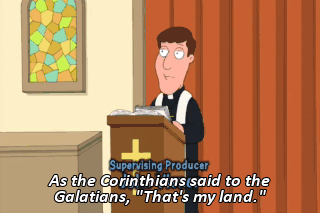 As the Corinthians said to the Galatians, "That's my land." (ALL LAUGHING) (LOIS LAUGHING OBNOXIOUSLY) LOIS: Look out, Gallagher! PETER: Stop kissing ass.