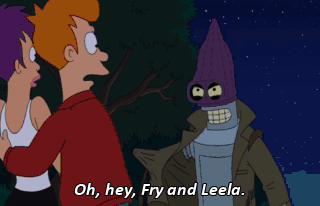 Oh, hey, Fry and Leela. Bender? What are you doing? I'm just out for my nightly crime spree. Which reminds me, this is still a mugging, so... - Hee-ya! - Ow! (GRUNTING) Help, I'm being mugged!