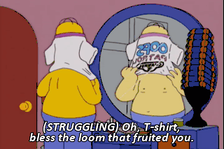 (STRUGGLING) Oh, T-shirt, bless the loom that fruited you.