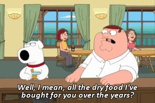 Well, I mean, all the dry food I've bought for you over the years? Yeah, well, you don't deserve her, you know that? Say what, now? You don't deserve her.