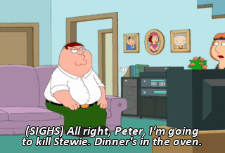 (SIGHS) All right, Peter, I'm going to kill Stewie. Dinner's in the oven. All you have to do is turn it to 350 at about 5:15. Yeah, okay, Lois. Are you listening?