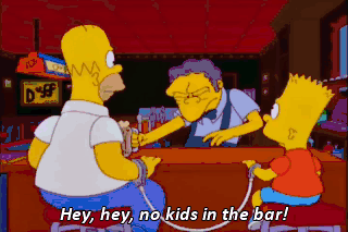 Hey, hey, no kids in the bar! Since when? Oh, the heat's been on since them Bush girls were in here.