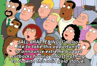 (ALL CHATTERING) I'd also like to take this opportunity to announce extreme budget cutbacks having almost nothing to do with this solid gold statue.