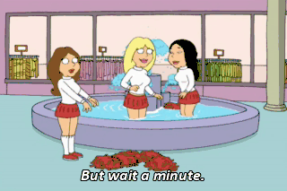 - Me, too. - But wait a minute. We don't want to get our sweaters all wet. Better take them off.