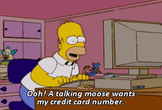 Ooh! A talking moose wants my credit card number. That's only fair. (STRAINING)