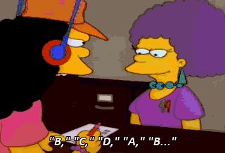 "B," "C," "D," "A," "B..." Homer had a piece of food on his face for three days. It wasn't little either. It was a chicken wing. Wing! Ooh, what was that? It doesn't matter. Let's get some margaritas.