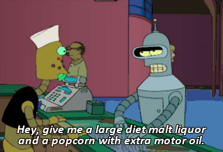 Hey, give me a large diet malt liquor and a popcorn with extra motor oil.