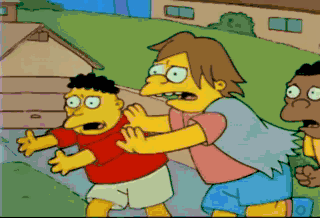 All right, you kids ! Keep it down ! Am I making myself-- Heh-heh-heh ! Got him ! You, up in the tree. The tall gray-haired kid. Get your butt down here right now ! Doh !