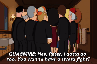 QUAGMIRE: Hey, Peter, I gotta go, too. You wanna have a sword fight? JOE: Ooh, I want in on that.