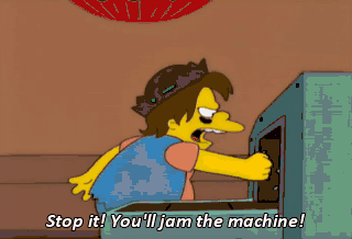 Stop it! You'll jam the machine! Uh-oh! Radiation. Duck and cover! Cool. Bart!