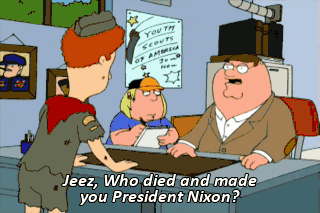 Jeez, Who died and made you President Nixon? Look, it's been 2 years! Your idiot son hasn't earned a single merit badge. Now If you'll excuse me, I've got to administer some spankings.