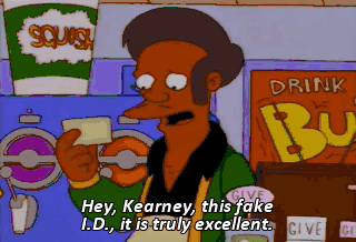 Hey, Kearney, this fake I.D., it is truly excellent. Say, if you tell me where you obtained it, I will overlook the ice cream sandwiches concealed in your armpits, eh? Deal.