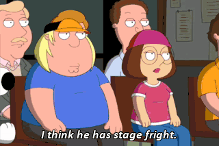 I think he has stage fright. I think he has stage fright, Peter. That's what I just said. I said that. (BAWLING) PETER: (LAUGHS) Look at Stewie. What a baby.