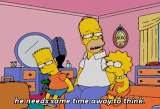 he needs some time away to think. But you’re not gonna get divorced like Milhouse’s parents, are you? Oh, no, no.
