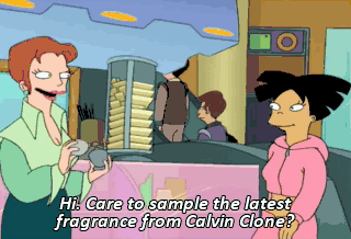 Hi. Care to sample the latest fragrance from Calvin Clone? No, thanks. And you, sir? No, thanks. I--