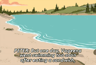 PETER: But one day, Vageena went swimming too soon after eating a sandwich, and this happened. Help! Help! I'm drowning! Help!