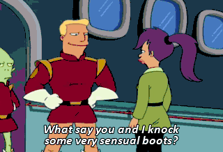 What say you and I knock some very sensual boots? It's tempting but, uh, I have a fiancÉ now. Uh-- Um-- Uh-- Um-- Uh-- Well-- Uh, him! Fry, darling, meet Zapp Brannigan. Huh? How do you do?