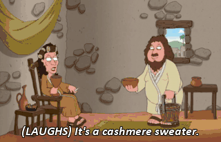 (LAUGHS) It's a cashmere sweater. Oh, wow! That's actually really nice. And now it's poo! (SHRIEKS) Well, here we are. Okay, guys, squeeze in. Bible photographer.