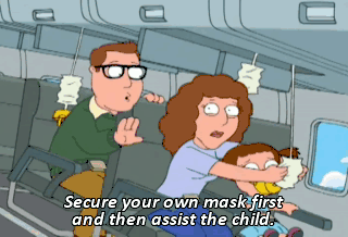 Secure your own mask first and then assist the child.
