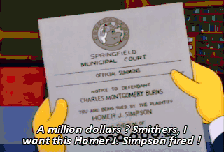 A million dollars ? Smithers, I want this Homer J. Simpson fired ! Uh, do you think that's wise, Mr. Burns ? I mean, think of the headlines. Uh-huh.