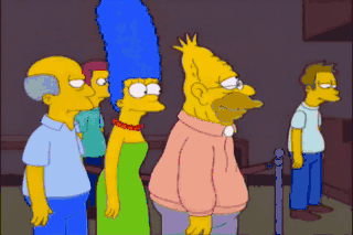 Next. Grampa's here to get his driver's license. Okay. Look at the eye chart and cover your left eye.