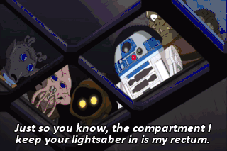 Just so you know, the compartment I keep your lightsaber in is my rectum. The mighty Jabba has decreed that you are to be thrown into the Sarlacc pit.