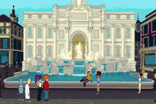 Wow, it hasn't changed in 1,000 years. Okay, everyone, into the fountain. What are you, senile? I'm not jumping in there. Hey, look. Coins.
