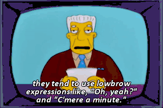 they tend to use lowbrow expressions like, "Oh, yeah?" and "C'mere a minute." Oh, yeah? They think they're better than us, huh? Bart, c'mere a minute! You c'mere a minute! Oh, yeah?