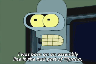 I was born on an assembly line in the bad part of Tijuana. Mama. Wah! Wah! Wah!