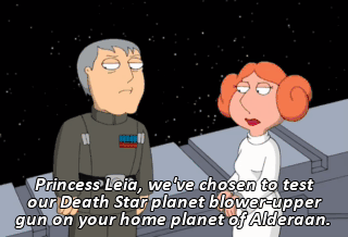 Princess Leia, we've chosen to test our Death Star planet blower-upper gun on your home planet of Alderaan. No! She said no. Should we still do it? Yeah.