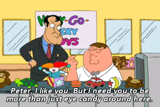 Peter, I like you. But I need you to be more than just eye candy around here. It's your job to watch for any toys that could be hazardous to kids. Now, look sharp!