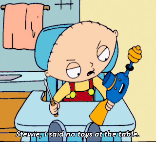 Stewie, I said no toys at the table. Damn you, vile woman! You've impeded my work since the day I escaped from your wretched womb.