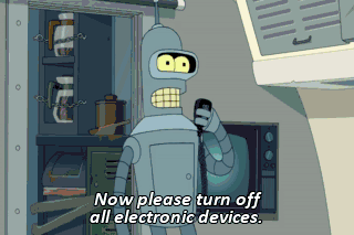 Now please turn off all electronic devices. (BENDER POWERING DOWN) Preparing for takeoff.