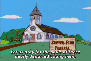 Let us pray for the souls of these dearly departed young men, Huckleberry Finn and Thomas Sawyer. Now for the traditional lowering of the bodies into the coffins.