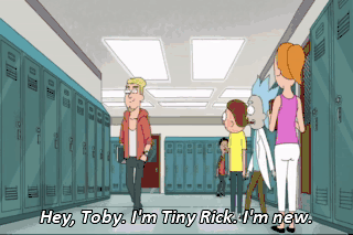 Hey, Toby. I'm Tiny Rick. I'm new. Hey oh -- Go easy on me. Ha ha. Just kiddin'. Hey, I like your straightforward style and that lab coat's pretty cool.