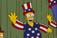 (GUNS COCKING) Simpsons, you are under arrest for the violation of the Government Knows Best Act. Martha, play something to lighten the mood. (PLAYING TAKE ME OUT TO THE BALL GAME)
