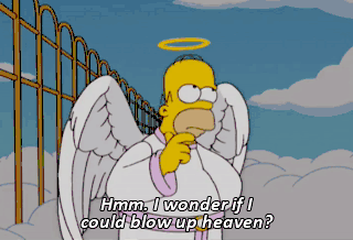 Hmm. I wonder if I could blow up heaven? GOD: Homer Simpson, it's time you got what's coming to you. Your Frisbee. Cool. You guys got a good buffet up here?