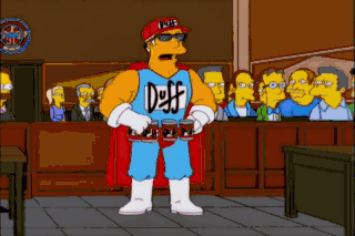 Oh, yeah! Objection. That party-hearty attitude... is a registered trademark of the Duff Corporation. Whatever happened to... fair use? Lousy community service. Meals on Wheels. Eat it up or I go to jail.