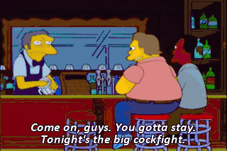 Come on, guys. You gotta stay. Tonight's the big cockfight.
