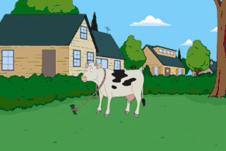 Peter, where'd you get that cow? Oh, that's a silly question, Lois. I bought it so we can have fresh milk every day. (MOOING) Whoa, boy, that Red Bull's some strong stuff. (CHRIS SCREAMING)