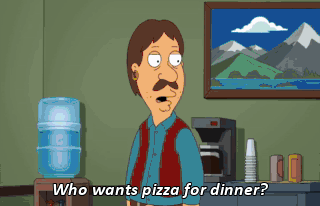 Who wants pizza for dinner? And who wants Purina Moist and Meaty Dog Chow? (ARGUING) I had that for breakfast!