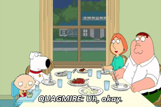 QUAGMIRE: Uh, okay. CHRIS: Now we're going to the Swansons! (MEG SOBBING) (CHRIS GRUNTING) (YELLING) Oh, my God! I think Chris is having a heart attack! We're not supposed to leave the table.
