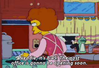 Neddie, it's 8:45. The post office is gonna be opening soon. 8:45? Here I am, yappin' away like it's 8:35!