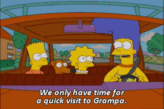 We only have time for a quick visit to Grampa. So as soon as he feels loved, we're out of there. (BARKING) Oh, he must smell leftovers. Please. We call them senior citizens.